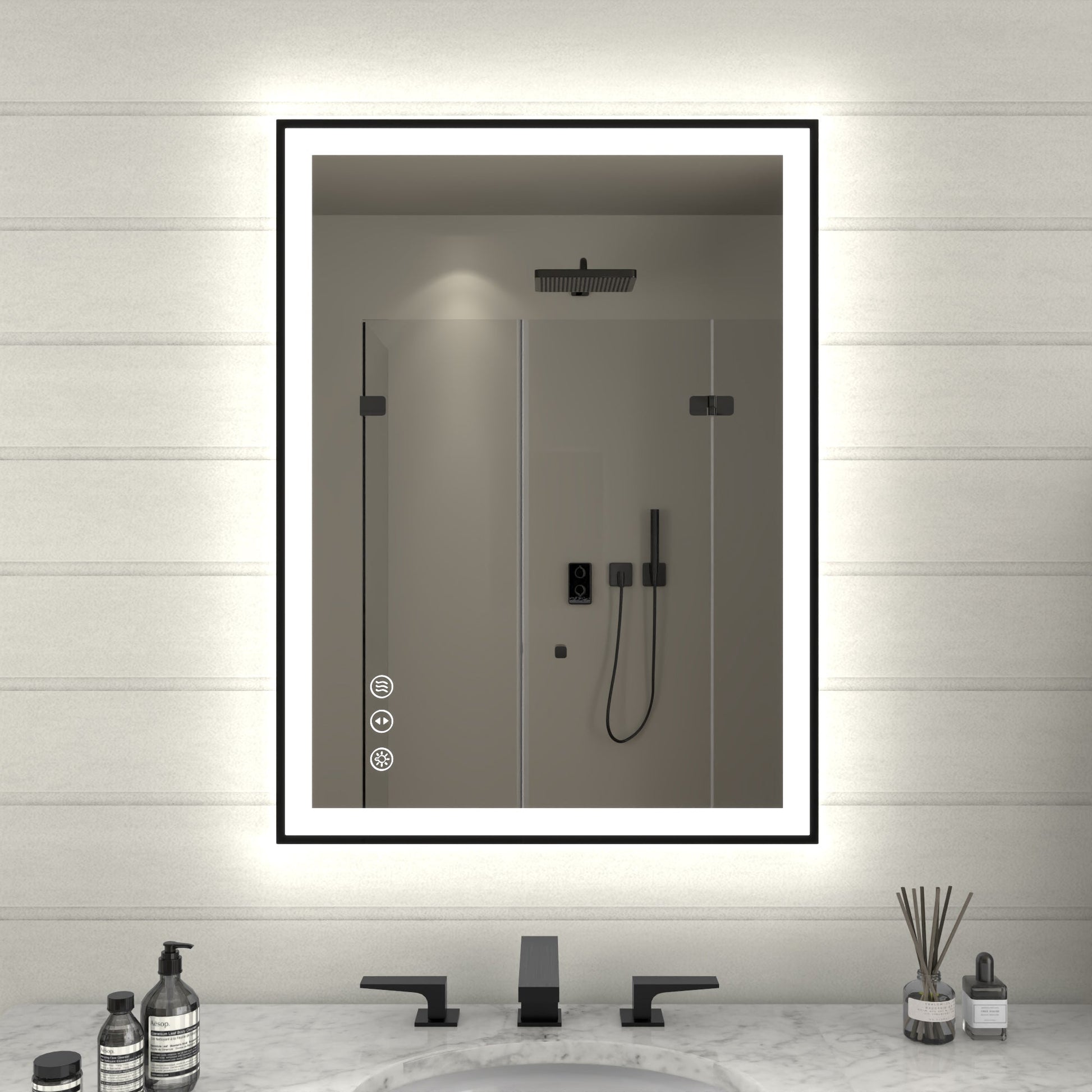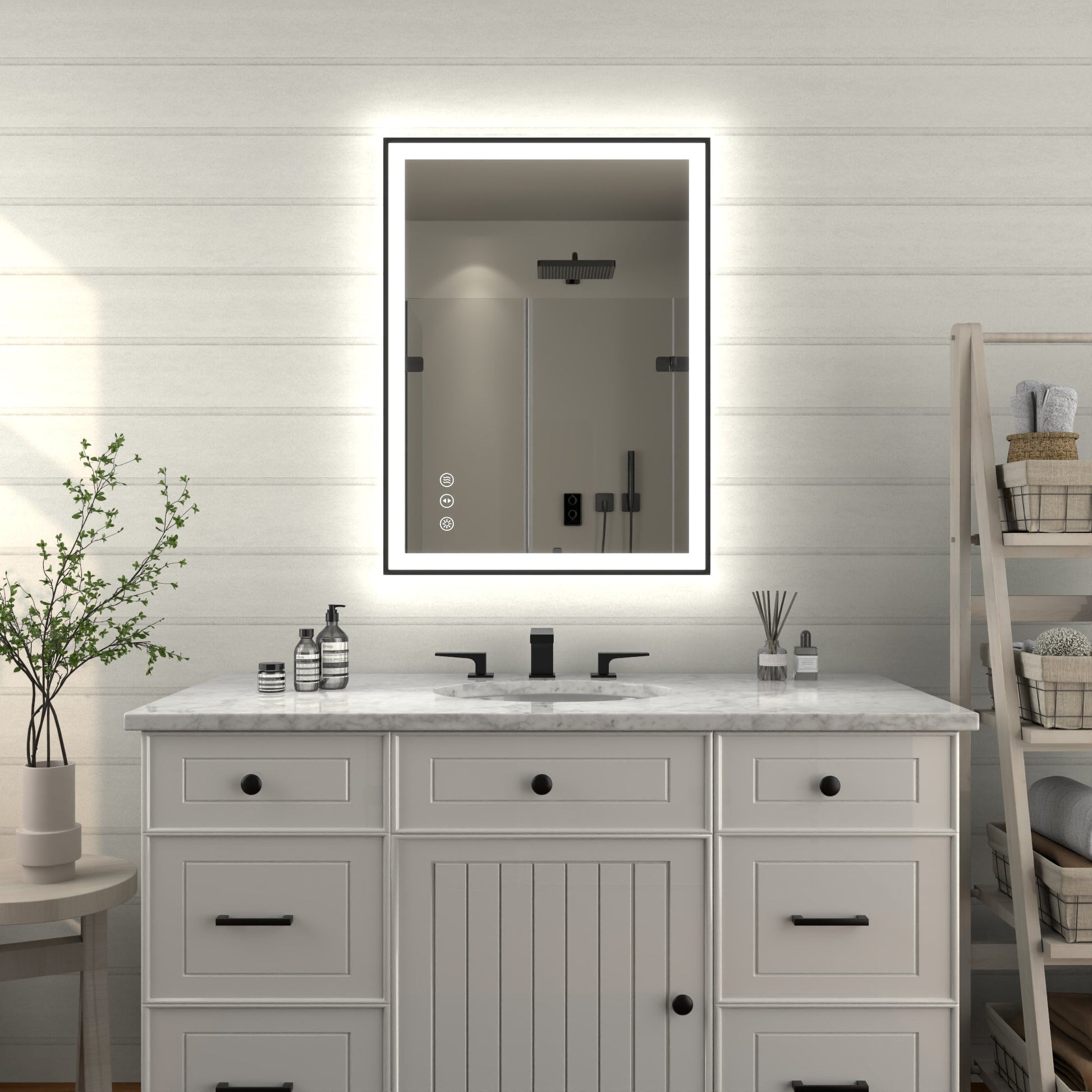 - 【Vanity Mirror with Defogging System】With anti-fog function, our bathroom mirrors can quickly remove the water vapor on the mirror surface and maintain a clear and transparent state. No need to wipe the mirror after bathing. Free your hands. Anti-fog feature will auto off after one hour.