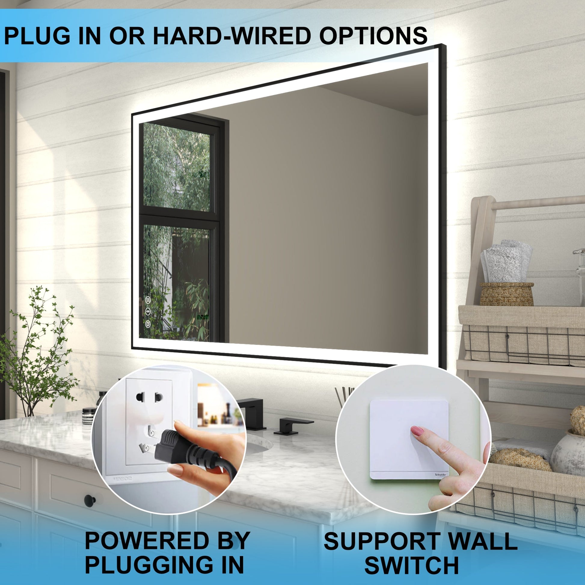 - 【Plug in/Hardwired】Two installation methods are available. Apex mirrors can be powered by either wiring it directly to electrical cables in the home or plugging it into an electrical outlet. And memorize the brightness setting last time automatically.
