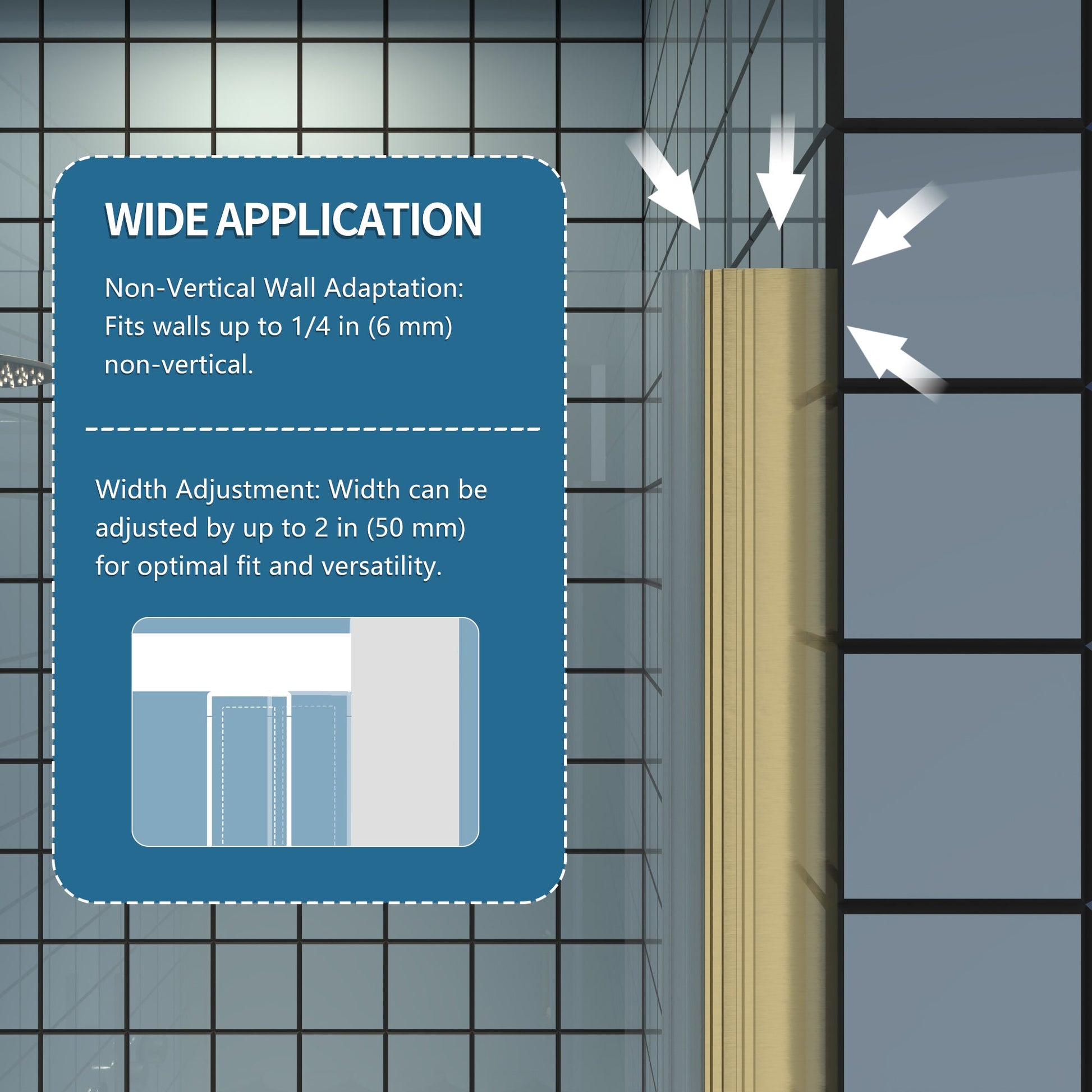 Flexible Installation: 2in adjustable range allows for easy customization without affecting the entry width. Suitable for irregular walls with 1/4in non-vertical adjustment, making it ideal for unique bathroom layouts.