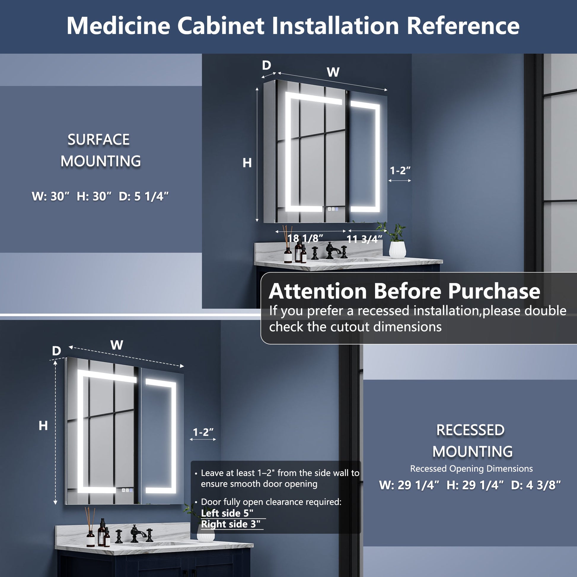 Boost-M1 30" W x 30" H Square Led Lighted Mirror Medicine Cabinet Recessed or Surface Mount,Defog