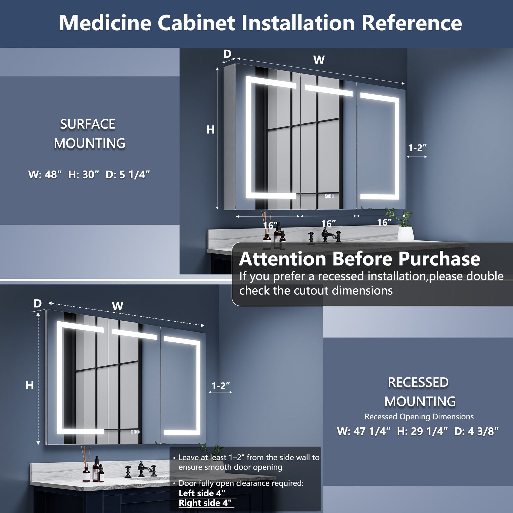 Boost-M1 48" W x 30" H Lighted Medicine Cabinet,Recessed or Surface led Medicine Cabinet,Three Glass Shelves