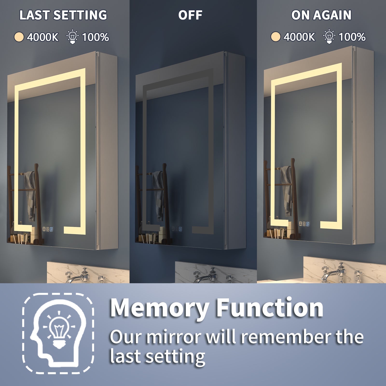 - Stepless Adjustable Interior LED Lighting: The lighted medicine cabinet features brightness settings that can be adjusted from 10% to 100%, allowing users to customize the illumination to their preference. With a color temperature range of 3000k to 6000k, the cabinet offers three distinct color options and a stepless adjustment feature to suit individual desires. Additionally, the interior lighting provides full illumination, facilitating the quick retrieval of items.