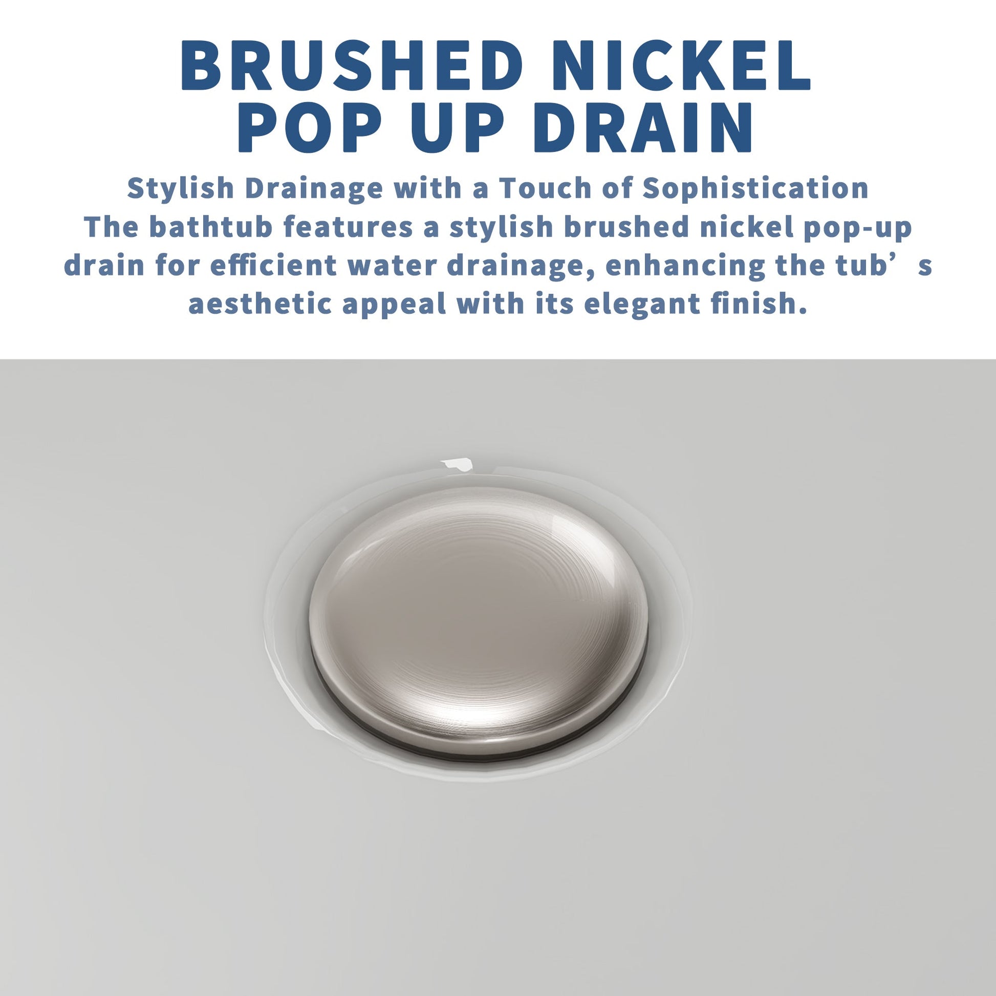 Premium Quality and Finish: Experience the pinnacle of luxury with our high-gloss white acrylic bathtub. Paired with a Brushed Nickel overflow and pop-up drain, this bathtub combines durability with timeless elegance. It's not just a fixture; it's a centerpiece that elevates your bathroom's aesthetic appeal.