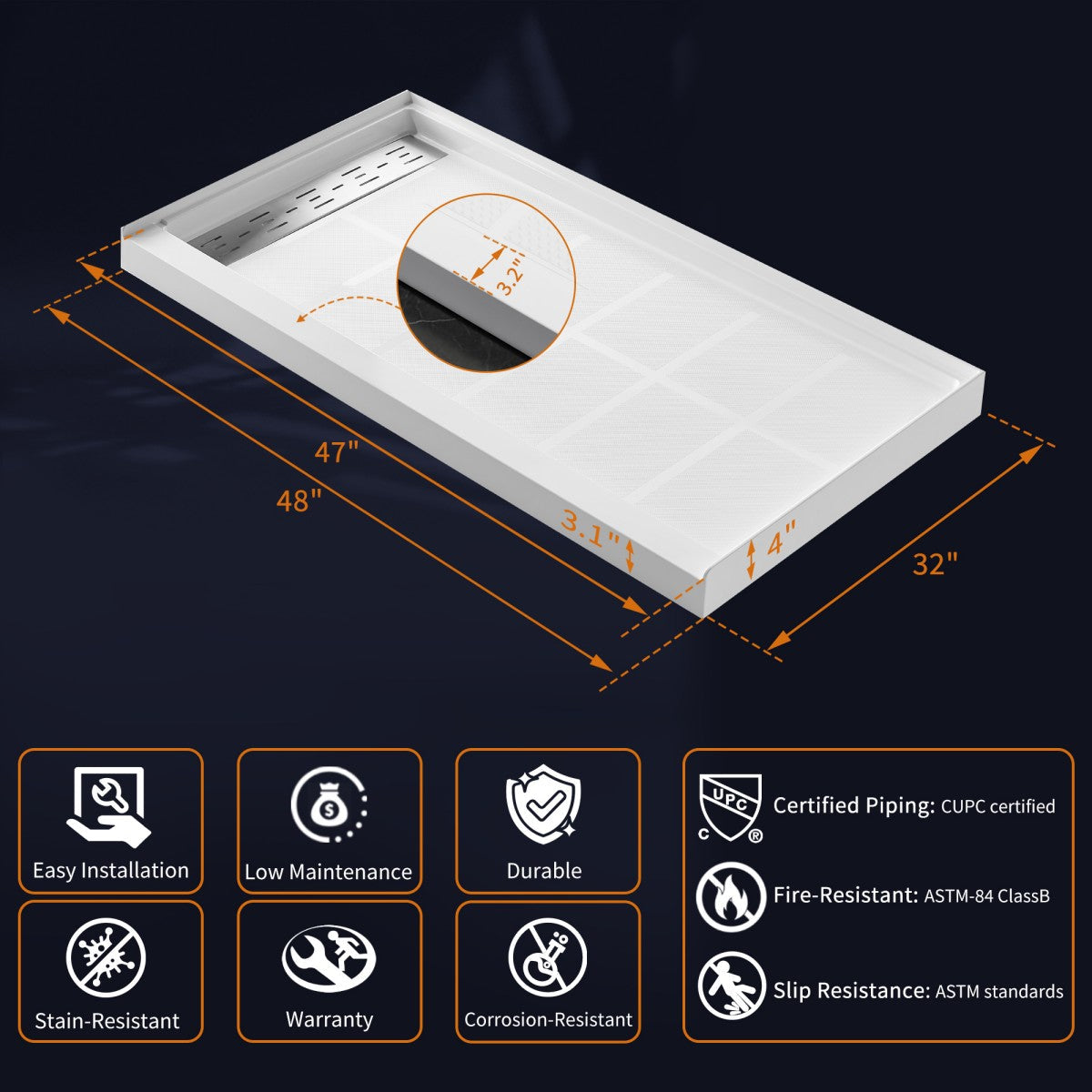 • ASTM Standard Compliance: Slip-resistant and CUPC Certified, adhering to U.S. plumbing codes.