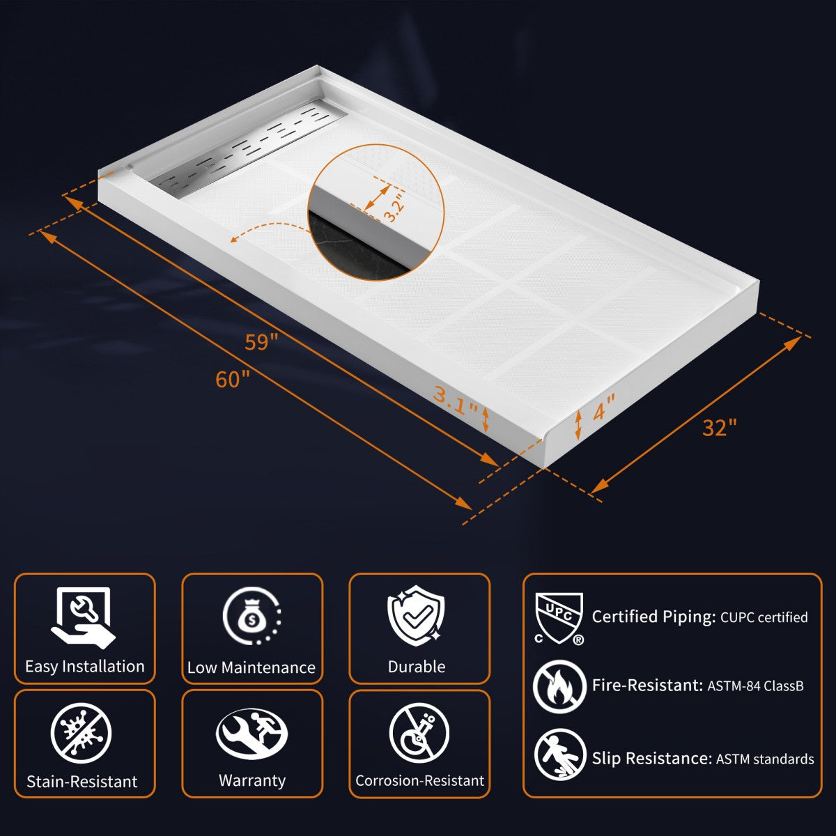• ASTM Standard Compliance: Slip-resistant and CUPC Certified, adhering to U.S. plumbing codes.