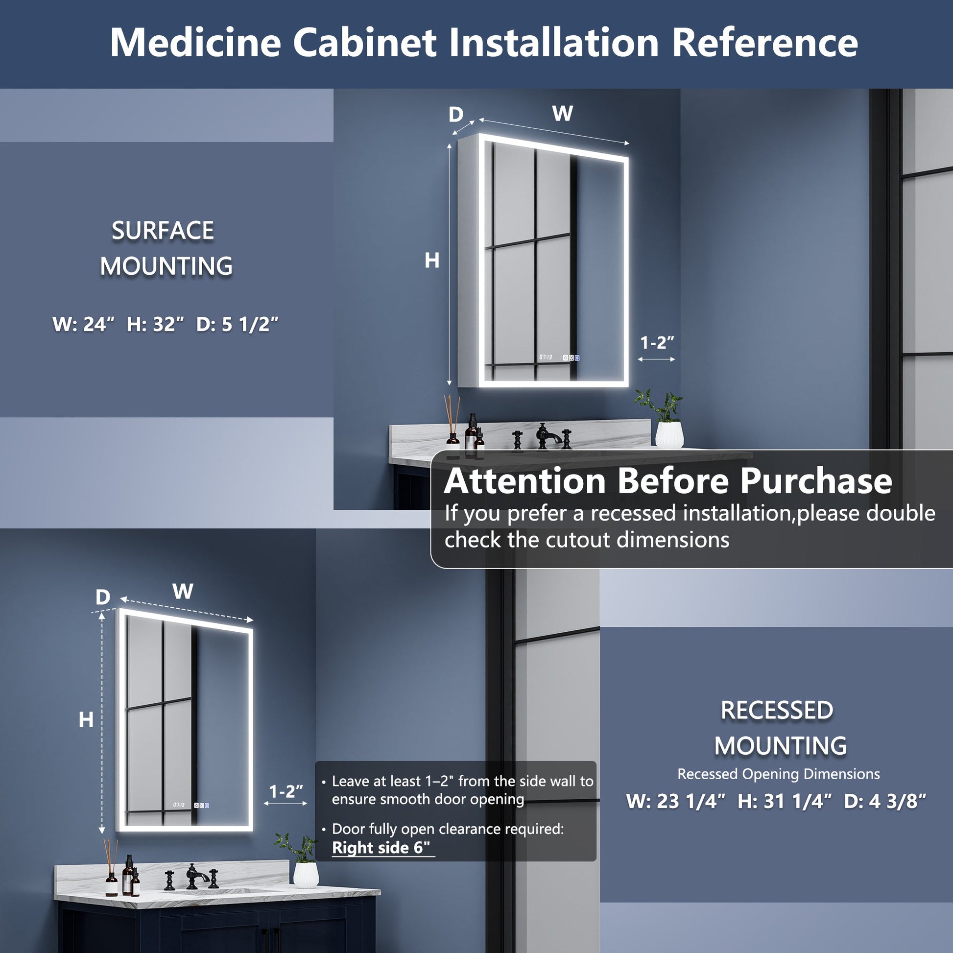 - 【Recessed Installation Supported】Being embedded in the wall to keep about 1 in. protrusion distance for easy opening and closing and less spatial occupation. Also,Our led medicine cabinet possible to mount it directly on the wall still.